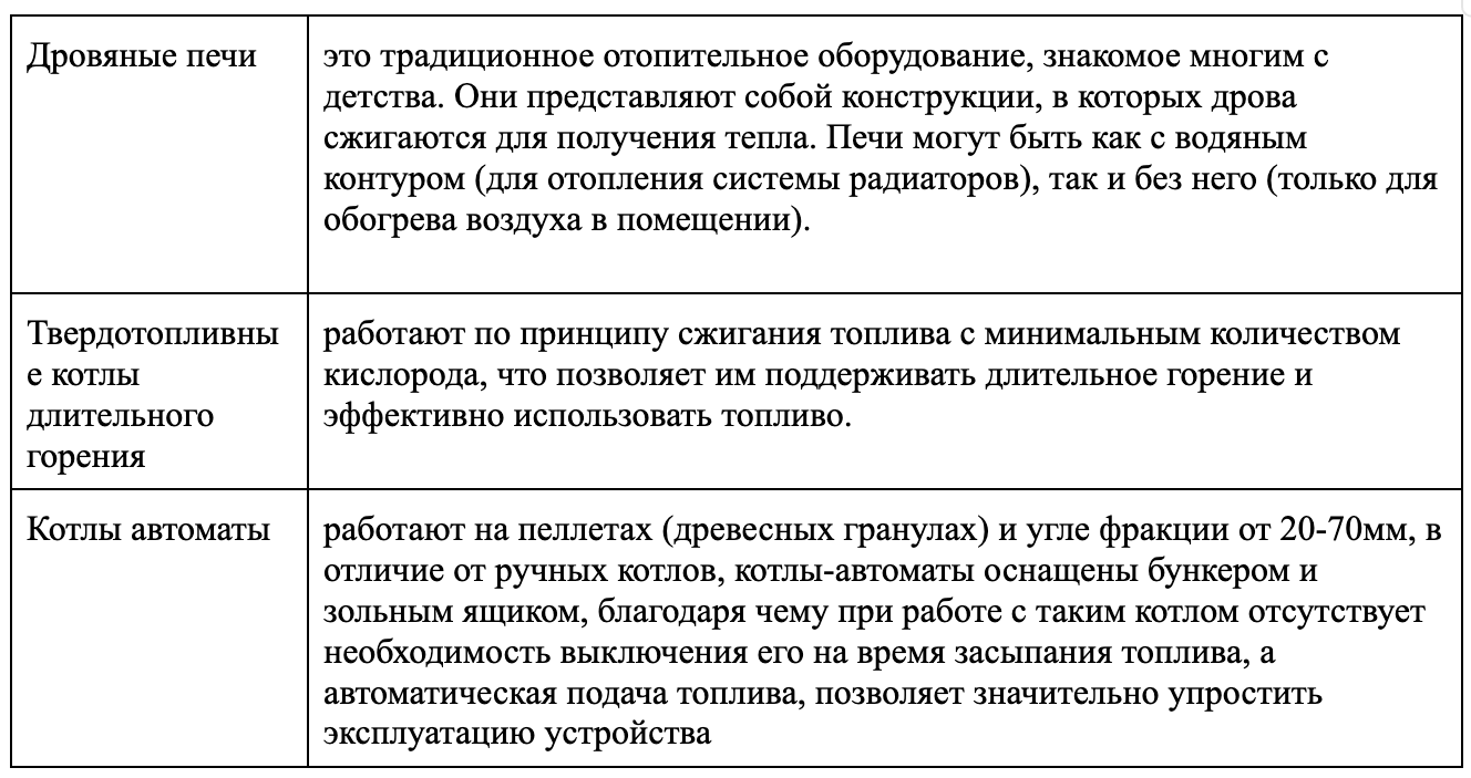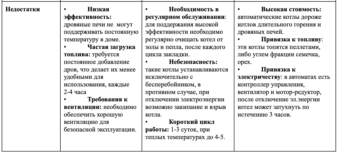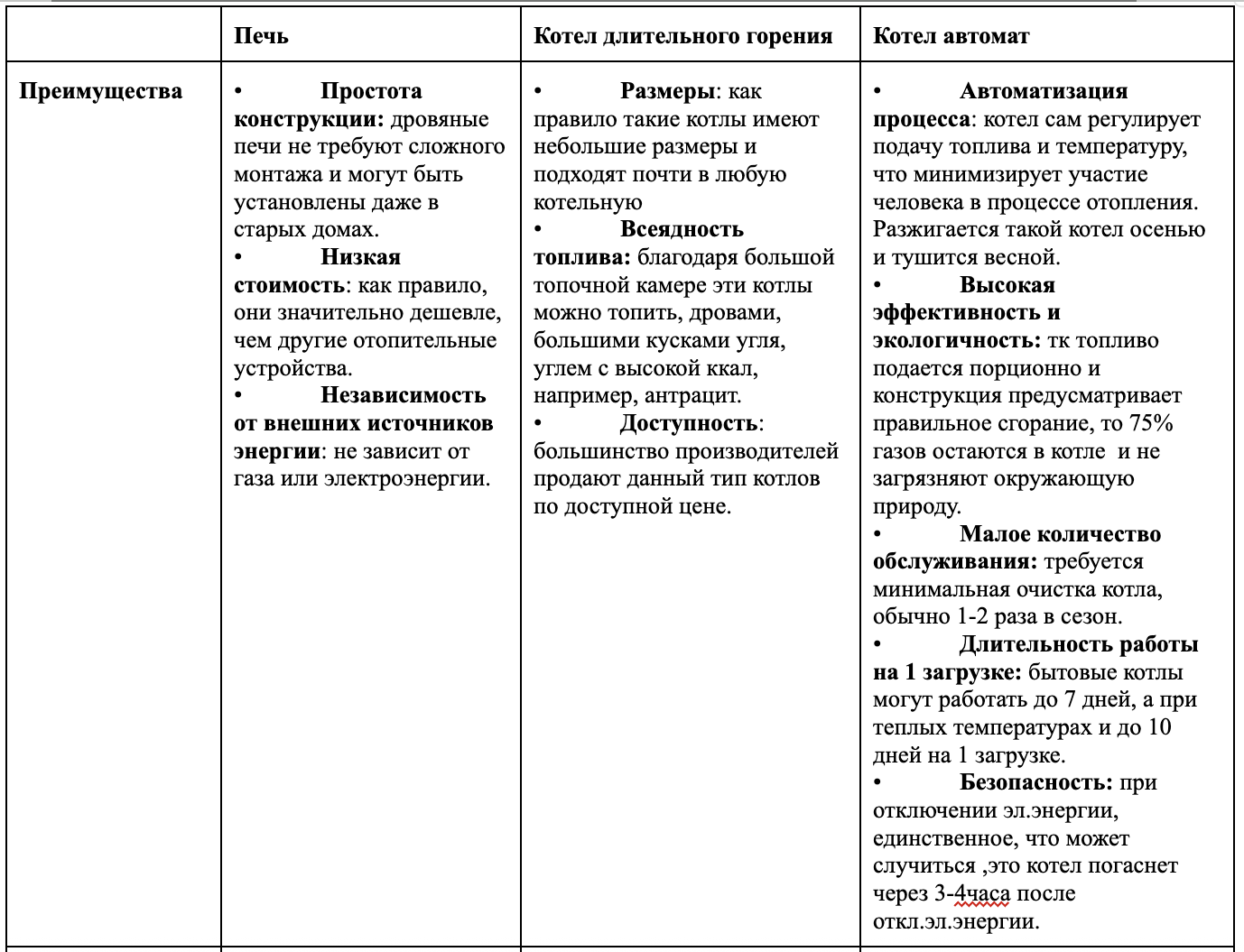 ИтогиКаждый тип отопительного устройства имеет свои особенности и подходит для разных условий эксплуатации. Дровяные печи — это удобный вариант для дач и небольших домов, но они требуют постоянного внимания и не всегда могут поддерживать комфортную температуру. Твердотопливные котлы длительного горения - более удобны, но не безопасны и требуют частого вмешательства человека. Автоматические котлы — это наиболее удобный и эффективный вариант для тех, кто ценит комфорт, безопасность и минимизацию вмешательства в процесс отопления, однако их стоимость и привязка к размеру угля могут стать ограничивающим фактором.